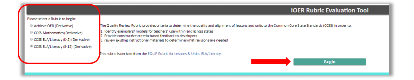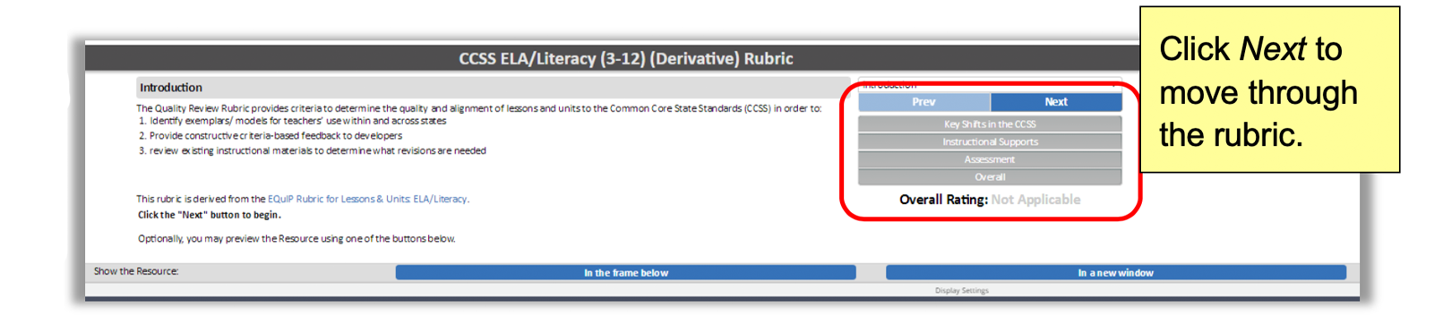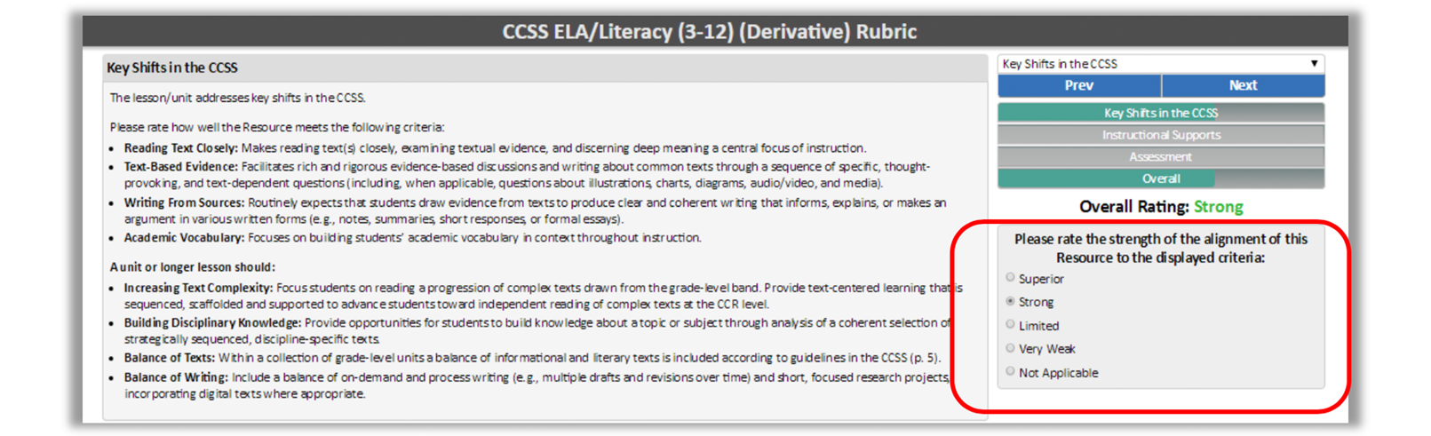 5. You will be able to rank the resource on 3 criteria: Key Shifts in CCSS, Instructional Supports, and Assessment. Click Next to begin the evaluation.