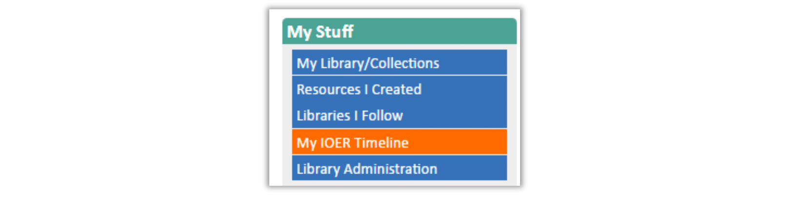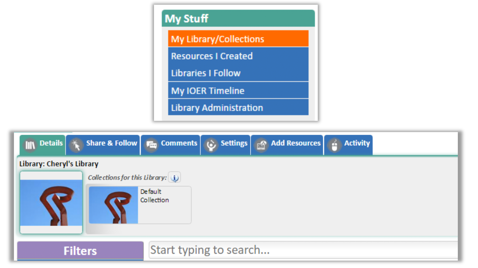 3. The left side navigation menu lets you update your profile, view your library and collections, see resources you had created, explore the libraries you follow, view your timeline of activity, and facilitate library administration.